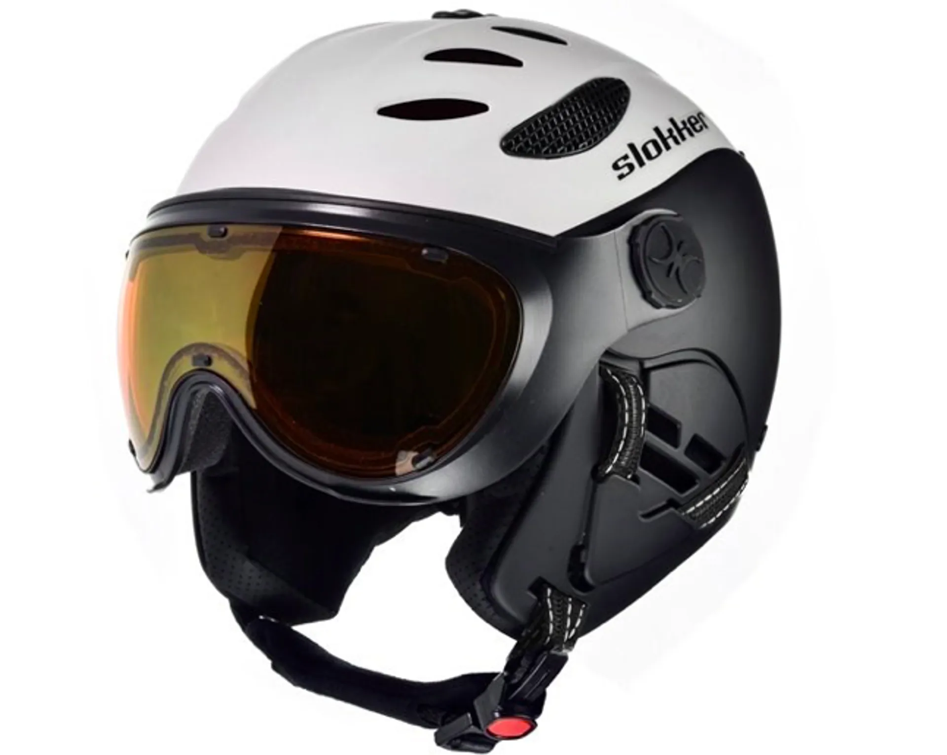 Slokker Balo Helmet has an adaptive, photochromic and polarising, double lens visor that ensures enhanced vision on cloudy days and protection in direct sunlight, its visor lens gives 100% UV protection. The visor's orange tint makes it ideal for bad weather. This helmet's  movable visor makes this helmet ideal for prescription eyewear users, as it will fit over them easily, and means goggles are not necessary The Balo helmet is lightweight and weighs in around 4890g and impresses with its stylish two-tone design. The helmet is constructed of a robust ABS shell and Coolmax interior for fast drying and designed to wick sweat away from the head ensuring a dry comfortable interior while active. The helmet's size dial allows adjustments for a perfect fit. Active Ventilation with 12 adjustable openings controlled with a slide, that is easy to use even with gloves on. Soft ear pads, and a padded, easy close chin strap for comfort. The Balo helmet meets EN1077 B safety standards. A helmet storage bag is included